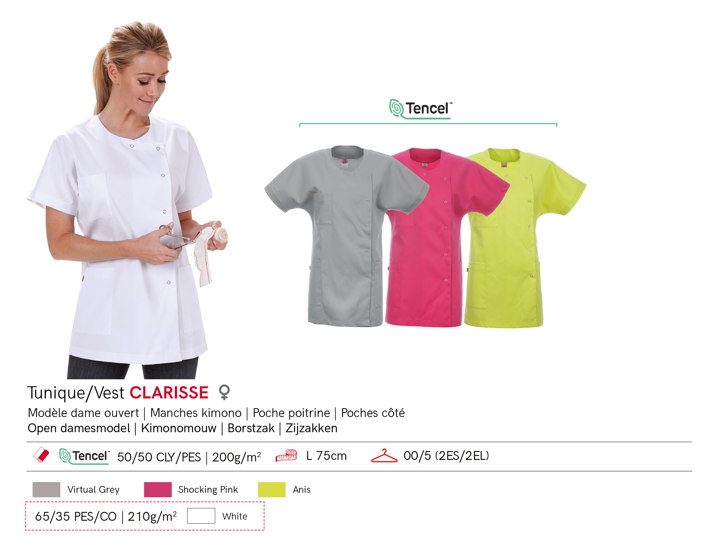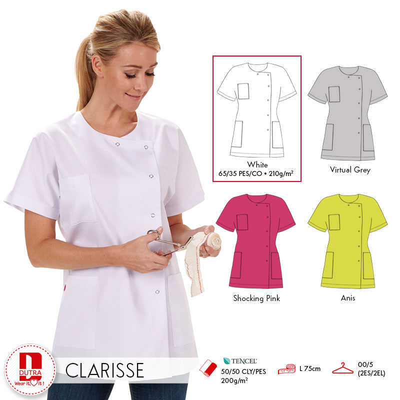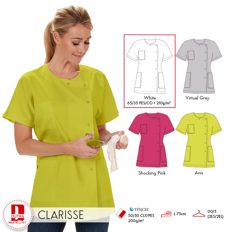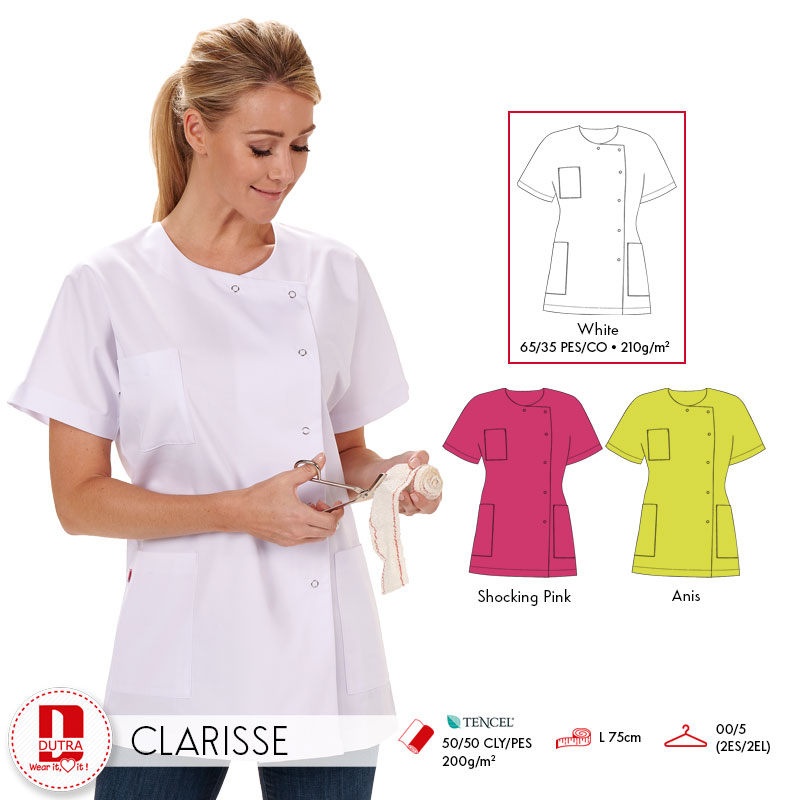 La tunique médicale dame CLARISSE est conçue spécialement pour les professionnelles de la santé telles que les infirmières, aides-soignantes, esthéticiennes, dentistes et vétérinaires. Ce modèle ouvert à pressions offre praticité et style. Avec des manches kimono pour un confort optimal, une poche poitrine pratique et des poches latérales pour vos outils essentiels. Fabriquée en TENCEL® avec une composition de 50% de CLY et 50% de PES, elle offre une légèreté agréable à porter et une durabilité à toute épreuve. Avec un poids de 200g/m² et une longueur de 75 cm, elle allie confort et élégance. Disponible en 4 couleurs tendance, cette tunique est proposée dans les tailles 00 à 5 (2ES à 2EL) pour un ajustement parfait.