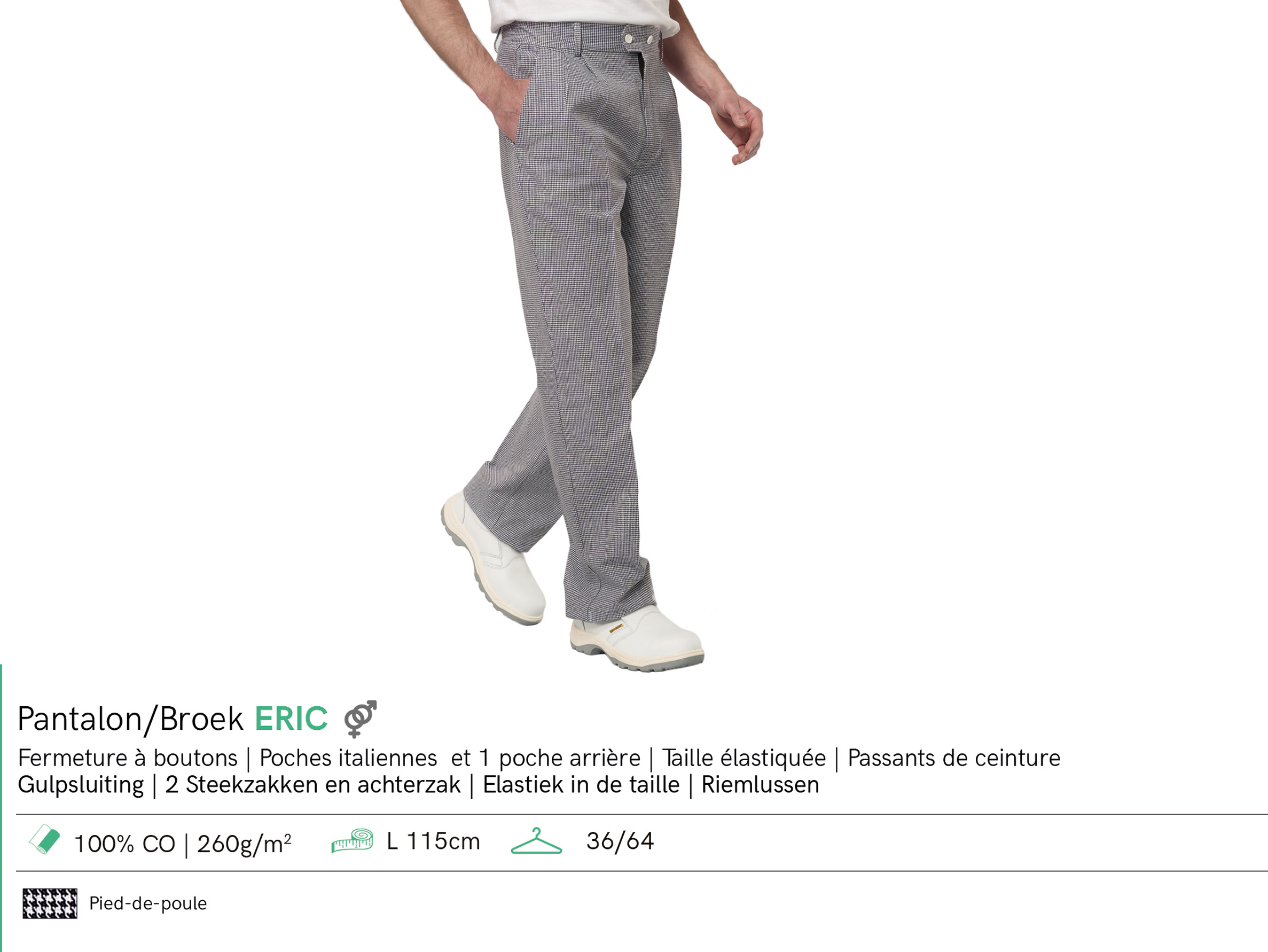 Le pantalon de cuisine pied-de-poule allie tradition et confort avec son design intemporel et sa fabrication en 100 % coton. Arborant un motif pied-de-poule marine, ce pantalon ajoute une touche d’élégance à votre tenue professionnelle. Sa fermeture à boutons, ses poches italiennes et sa poche arrière en font un choix fonctionnel. La taille élastiquée avec passants pour ceinture assure un ajustement parfait. Disponible dans une gamme complète de tailles, de 36 à 64, ce pantalon classique convient à tous. Optez pour un look sophistiqué et pratique en cuisine avec ce pantalon pied-de-poule.