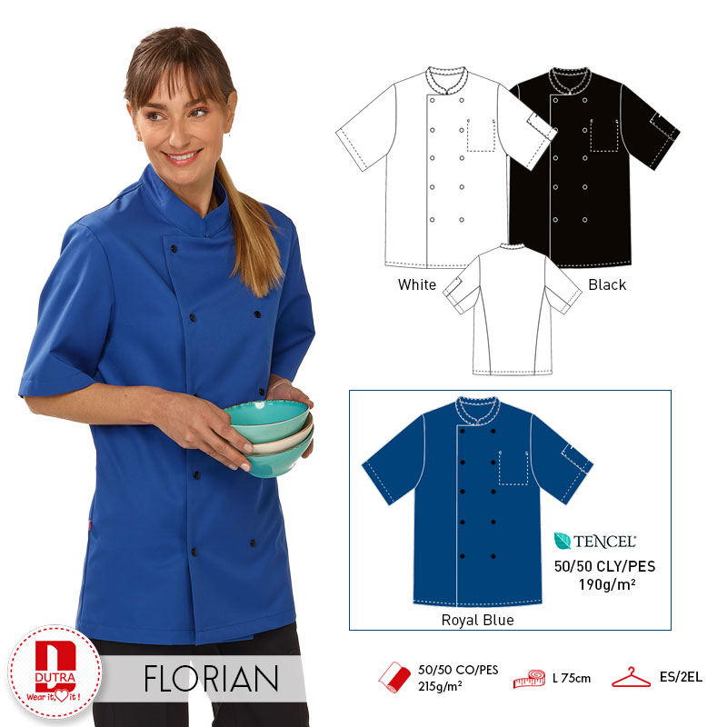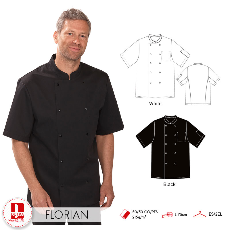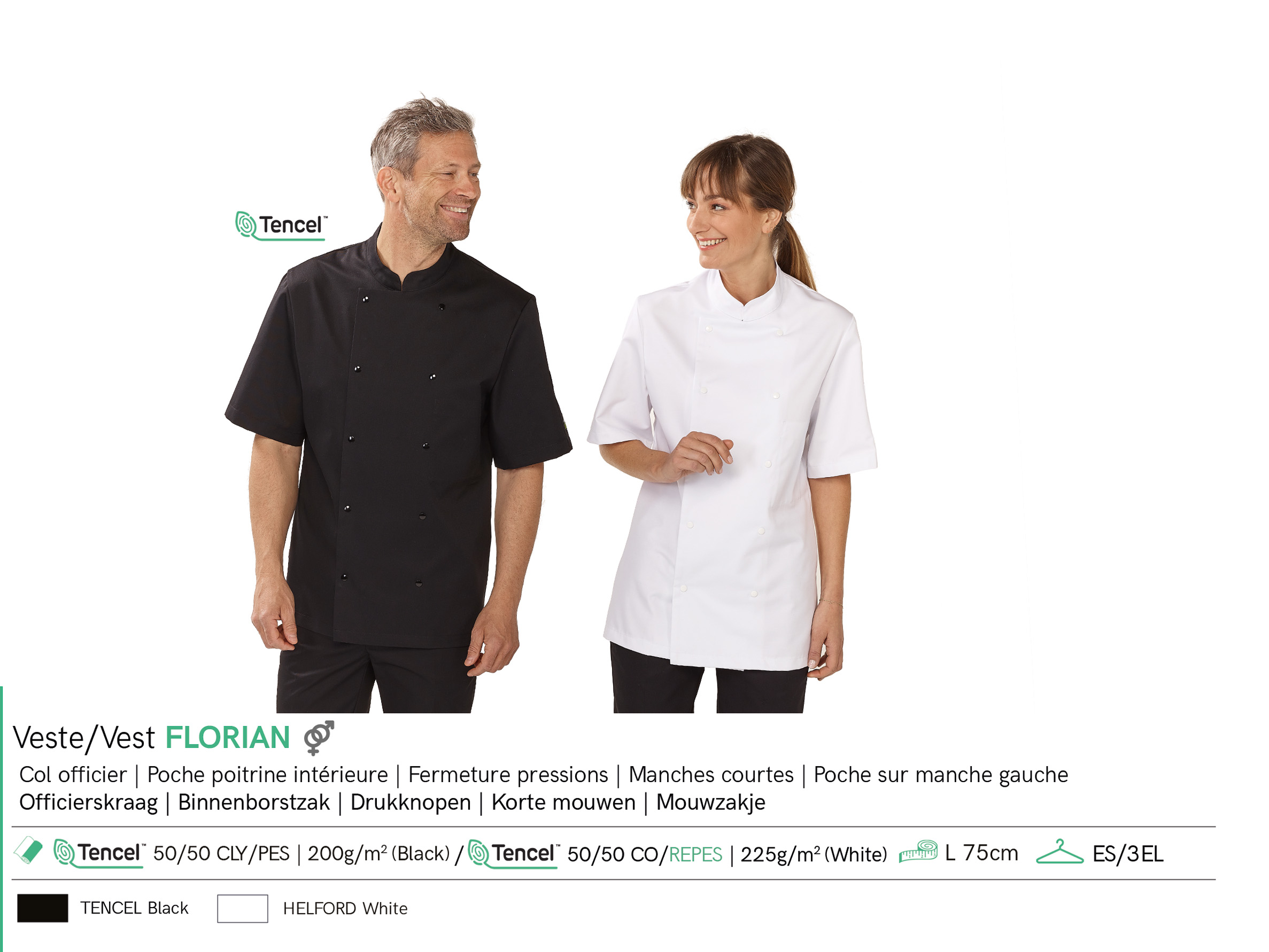 La veste de cuisine FLORIAN à manches courtes est un choix parfait pour les professionnels de la cuisine recherchant confort et style. Dotée d’une double rangée de pressions, elle assure un ajustement impeccable. Cette veste pratique offre une poche poitrine intérieure et une poche bic sur la manche, ainsi que des œillets d’aération sous les bras pour une ventilation optimale. Fabriquée en Tencel, elle allie résistance et confort, avec un tissu souple et satiné qui confère une sensation de légèreté.
