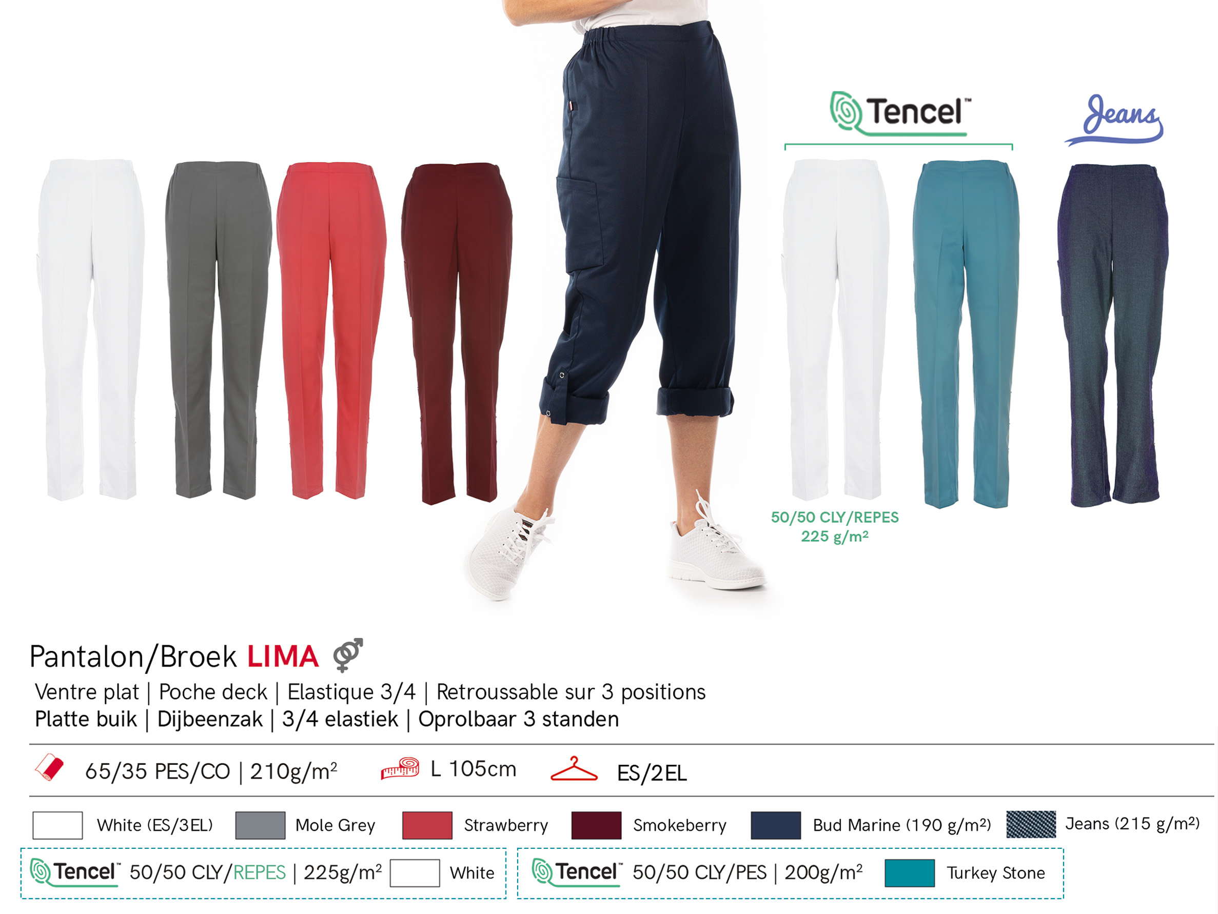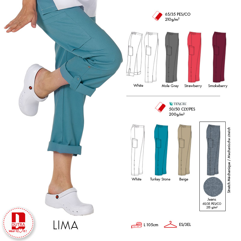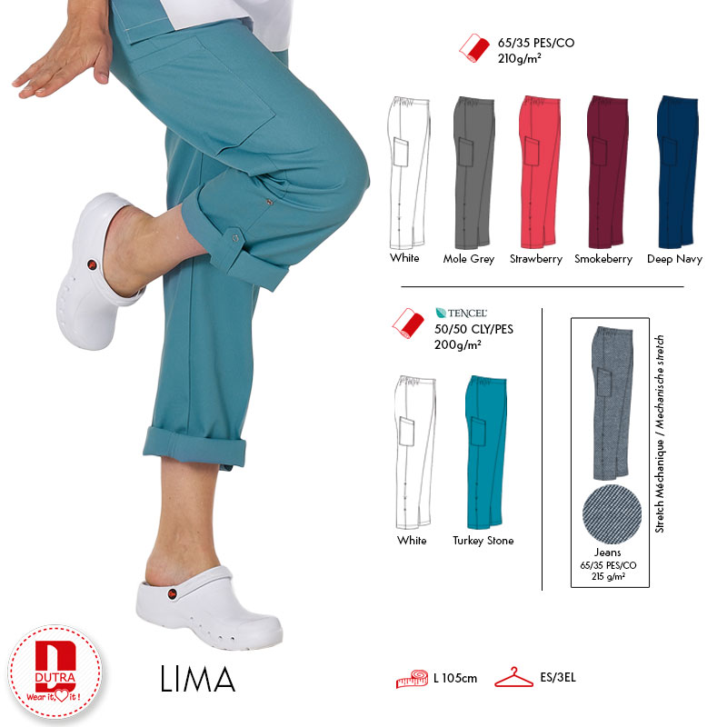 Découvrez le pantalon de soins retroussable de Dutra, avec élastiques et pressions dans le bas pour ajuster la longueur. Design ventre plat, poche deck, élastique 3/4, et retroussable sur 3 positions pour une polyvalence optimale. Fabriqué en différentes matières, dont 65/35 PES/CO, TENCEL® (50/50 CLY/PES) et jeans 65/35 PES/CO, ce pantalon offre choix de style et de confort. Disponible en 8 couleurs tendance, tailles de ES à 3EL. Optez pour ce pantalon médical pour une tenue alliant praticité et élégance.