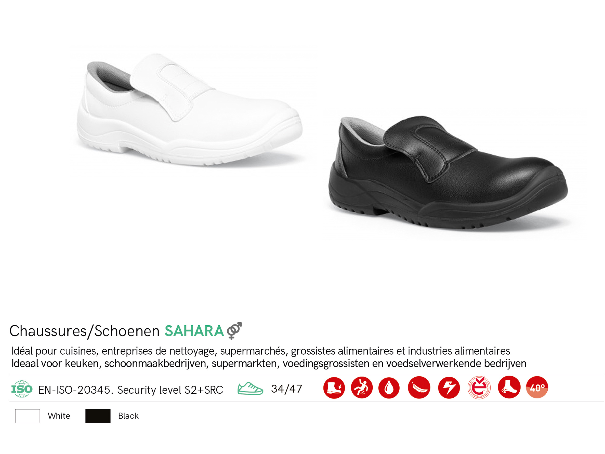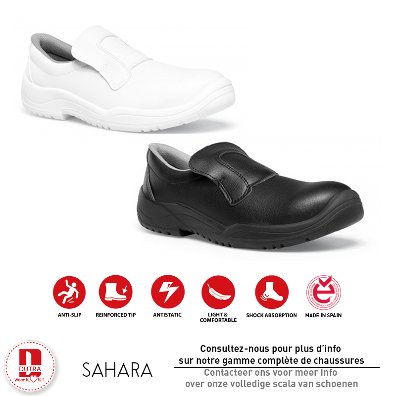 Assurez votre confort et sécurité avec nos chaussures de cuisine normées S2, modèle SAHARA. Dotées d’embouts de sécurité et de tiges en microfibre Lorica® doublées, elles garantissent une absorption rapide de l’humidité. Leur forme droite à bout arrondi et le contrefort maintiennent le pied efficacement. La semelle intérieure en polyuréthane offre un support et la semelle antidérapante assure une adhérence fiable sur les sols secs et humides. Les saillies cannelées facilitent l’évacuation des liquides. Disponibles en tailles 34 à 47, en noir et blanc, ces chaussures allient confort et fonctionnalité pour les professionnels de la cuisine.